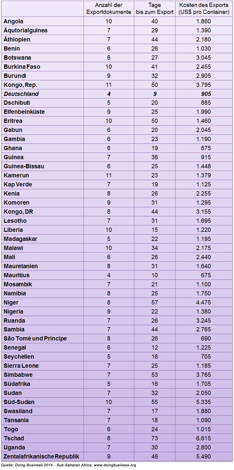 Die folgenden Schaubilder zeigen, wo die Volkswirtschaften Subsahara-Afrikas bei der Export- und Importabwicklung international einzuordnen sind sowie die Anzahl der jeweils erforderlichen Dokumente, die Abwicklungsdauer und die Kosten des Ex- und Imports pro Container in den einzelnen Ländern.