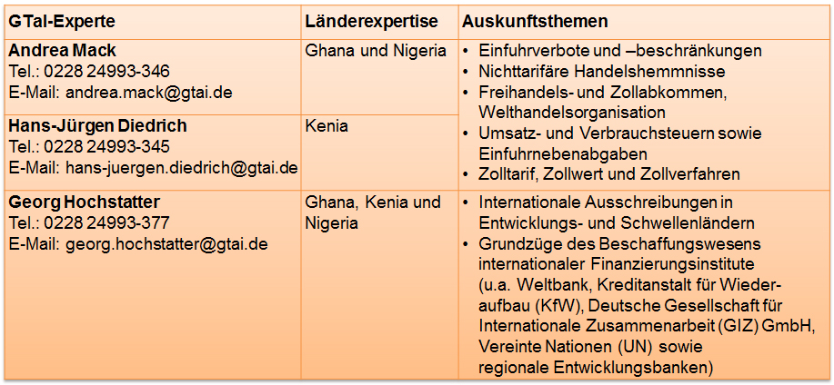 Der Auskunftsservice ,,Experts for Export” bietet deutschen Unternehmen die Chance, sich per Telefon oder E-Mail bei den Landesinsidern der GTaI über die Märkte Ghana, Kenia und Nigeria zu informieren. Der Service bleibt bis zu einem Rechercheaufwand von ca. einer Stunde kostenfrei.