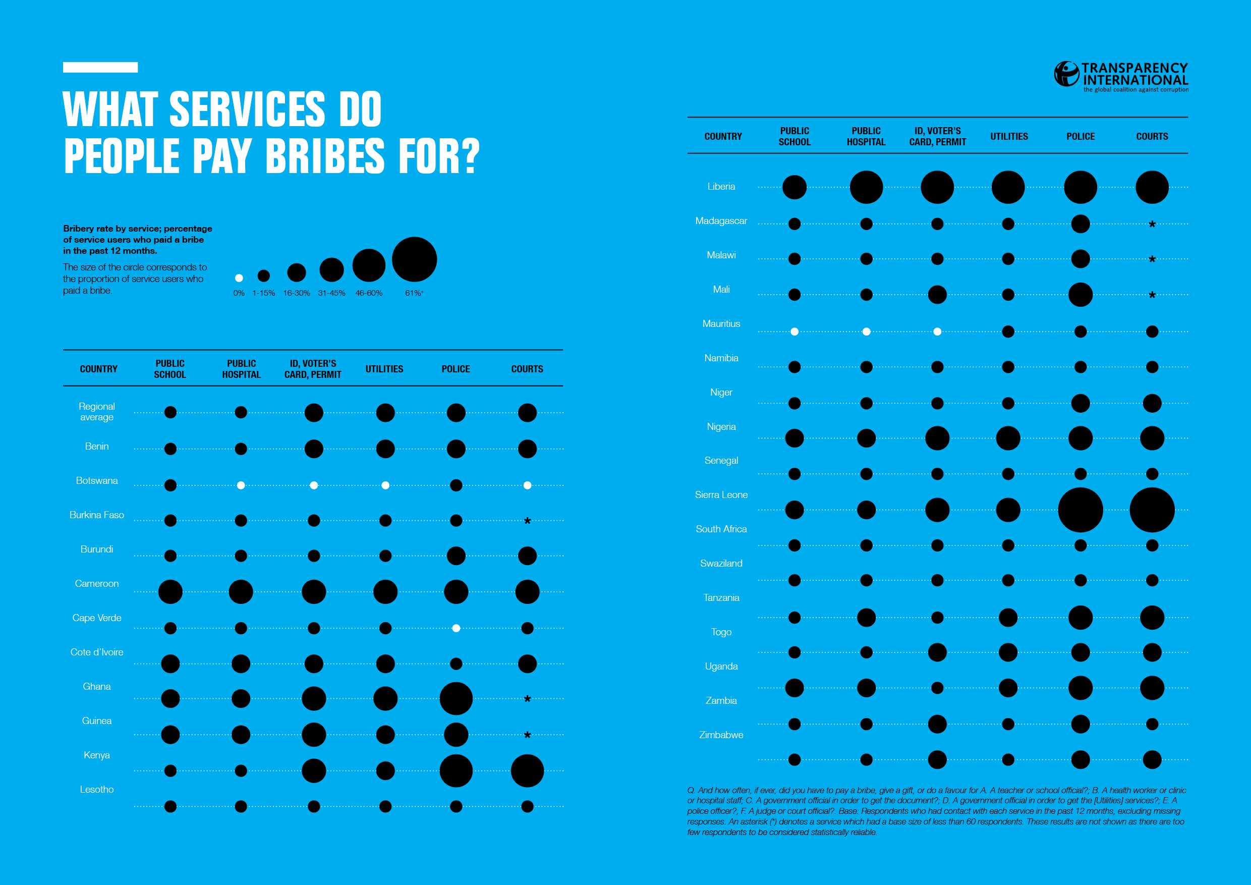 Nach dem Bericht waren 2013 und 2014 schätzungsweise 75 Millionen Menschen in der Region von Korruption betroffen. Die zwischen März 2014 und September 2015 Befragten kamen aus Benin, Botswana, Burkina Faso, Burundi, der Elfenbeinküste, Ghana, Guinea, Kamerun, Kap Verde, Kenia, Lesotho, Liberia, Madagaskar, Malawi, Mali, Mauritius, Namibia, Niger, Nigeria, dem Senegal, Sierra Leone, Sambia, Simbabwe, Südafrika, Swasiland, Tansania, Togo und Uganda.
