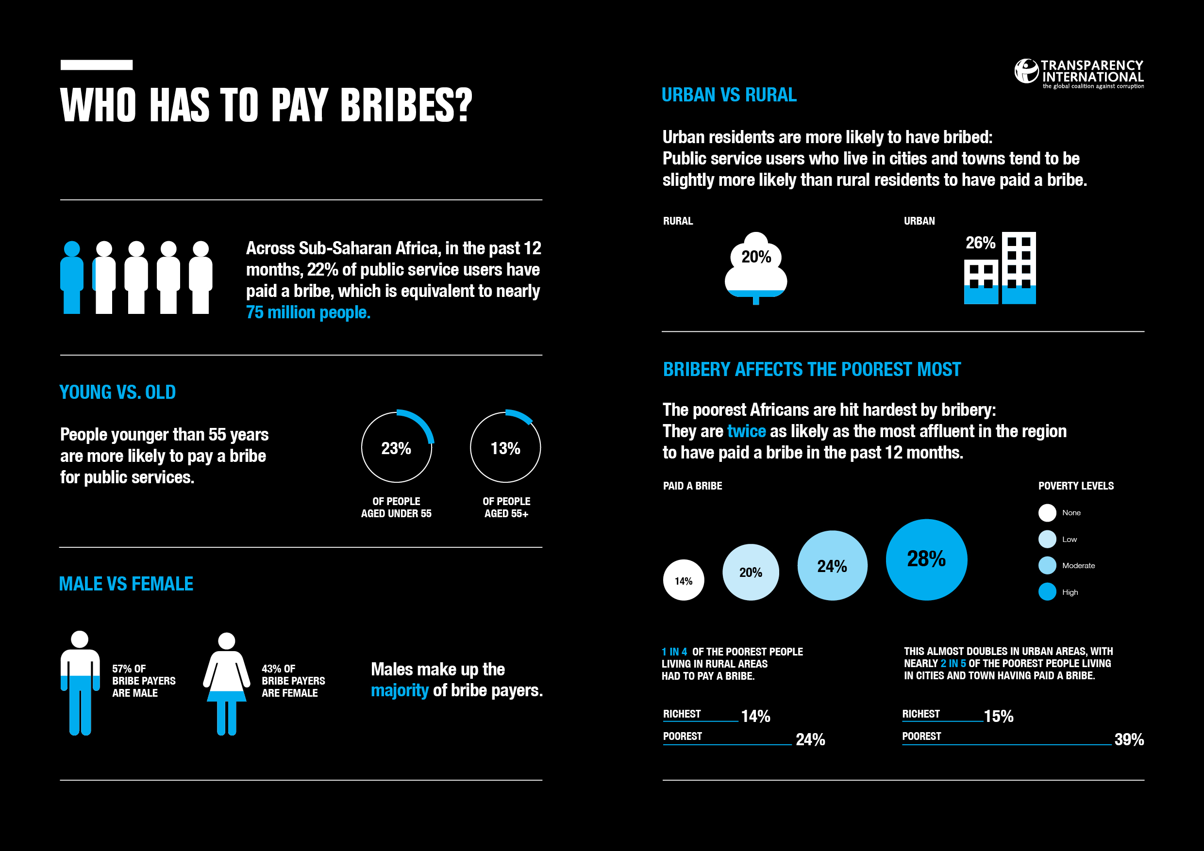 Opfer von Korruption sind besonders arme Menschen. Sie sind doppelt so oft betroffen, als besser situierte. Des weiteren trifft Korruption Städter eher als Menschen, die in ländlichen Gegenden leben.