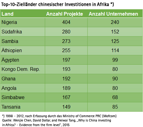 Aussagen über den Umfang chinesischer Investitionen in Afrika sind weitgehend auf Schätzungen angewiesen, da beim chinesischen Wirtschaftsministerium (Ministry of Commerce PCR, Mofcom) zwar die einzelnen Vorhaben, nicht jedoch deren Größenordnung registriert werden. Eine neuere ausführliche Untersuchung zu Chinas Afrika-Investitionen liegt von einem US-amerikanischen Wissenschaftlerteam von mehreren Universitäten vor (Why is China investing in Africa? – Evidence from the firm level, by Wenjie Chen, David Dollar, and Heiwai Tang, August 2015). Danach ist der Anteil der chinesischen Investitionen an den gesamten Auslandsinvestitionen in Afrika mit rund 3,2% (von insgesamt 630 Mrd. US$ Ende 2011) noch gering, denn die Chinesen kamen erst spät im Vergleich zu Europäern und Amerikanern. Nach Erfassung des Mofcom investierten zwischen 1998 und 2012 etwa 2.000 chinesische Unternehmen in 49 afrikanischen Ländern. Hierbei ist die Top-Destination für chinesische Engagements Nigeria, mit Abstand gefolgt von Südafrika, Sambia, Äthiopien und Ägypten.